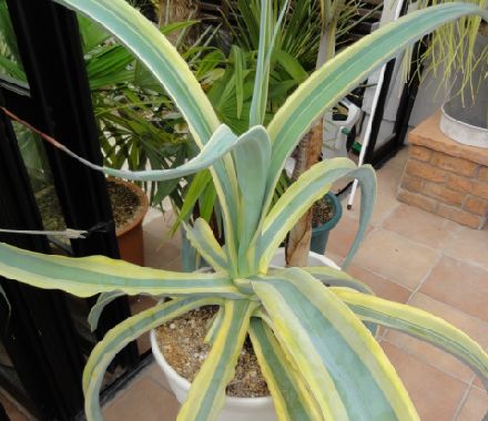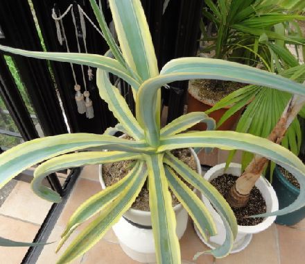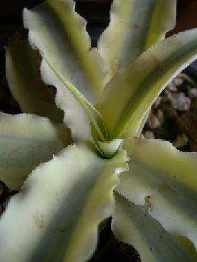 上記の斑入りも最後の1鉢となり、かなり大きく成長しました。ブルーにイエローのラインが入りとても綺麗な種類、また刺はないのですが、葉が柔らかく折れやすいのが欠点です。2012・4・21