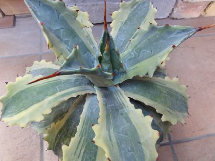 刺が赤く、葉もブルーとイエローカラーで綺麗なアガベです。小型の品種です。